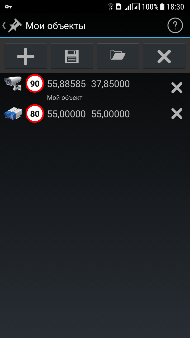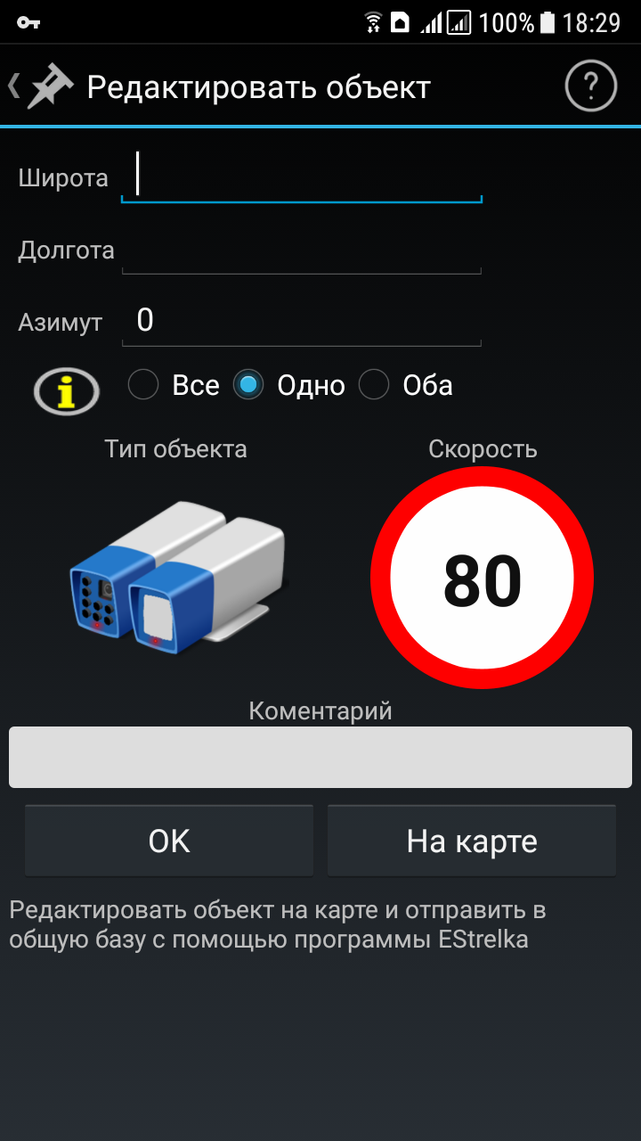 Стрелка - Объекты пользователяВ программе вы можете добавлять свои объекты (до 500шт) Есть несколько вариантов добавления объектов. - в процессе движения: 1. Добавление с помощью летящей кнопки 2. Добавление из основного окна 3. Добавления с виджета 3*2 - пульта управления (нижние 4 кнопки на фото). - дома или на стоянке 4. Добавление из программы. Варианты 1-3 (быстрое добавление) возможны только в движении и подставляют все параметры автоматически (скорость берется текущая, направление - все, угол - текущий, координаты - текущие), чтобы не отвлекать водителя от дороги. Предполагается, что по окончании поездки вы отредактируете эти объекты на карте с помощью программы EStrelka. ![]() Редактирование объектов на картеДля удобства редактирования радаров и камер видеофиксации ГИБДД прямо на карте, можно воспользоваться бесплатным приложением EStrelka. Редактирование объектовОтредактировать добавленные объекты можно в разделе "База объектов" -> "Объекты пользователя". При нажатии кнопки "Добавить Объект" вы попадаете в окно редактирования объекта. Необходимо заполнить требуемые поля "Долгота", "Широта", "Азимут". выбрать направление работы камеры, тип объекта, ограничение скорости. Также можно написать комментарий. Если вы в этот момент двигаетесь и сервисный процесс запущен, то координаты и угол подставятся автоматически. Остальные поля вам необходимо указать: 1. Направление работы. - Туда - объект(камера) контролирует только поток в одном направлении - Оба - объект(камера) контролирует поток в обоих направлениях. Также обозначаются две камеры, стоящие в одной точке, повернутые в разные стороны. - Все - Объект контролирует все направления в точке - указывается в основном для постов ГИБДД, а также для камер "по умолчанию", для светофоров и для прочих объектов, когда направления как-такового нет или их несколько. Тип направления отличный от "Все" указывайте только если вы двигаетесь или точно знаете угол. 2. Тип объекта выбирается из списка. 3. Скорость - указывается, если объектом является камера, измеряющая скорость, либо объект, где ограничена скорость. В остальных случаях можно не заполнять. 4. Комментарий до 100 символов. ![]() Для сохранения и восстановления объектов можно воспользоваться кнопками 2 и 3 сверху. Кнопка сохранения создает файл strelka/strelka_userpoints.upt А соседняя кнопка загружает содержимое из этого файла, если он существует. |