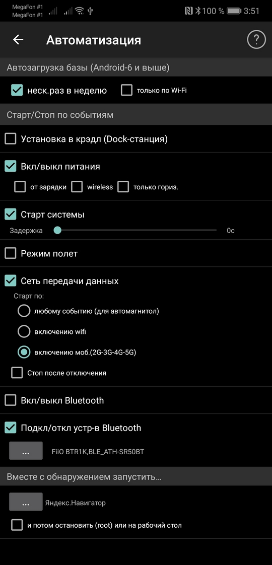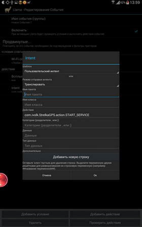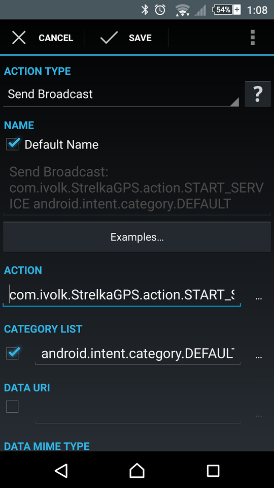 Автоматизация программы Стрелка - действия выполняемые по событиям1. Позволяет автоматически запускать рабочий режим программы при различных действиях: - Установка аппарата в док-станцию - Включение питания (причем можно выбрать, "только зарядка", чтобы программа различала подключаете ли вы устройство к компьютеру или к проводу питания, wireless и "только горизонтально") - Включение-выключение Bluetooth - Включение-выключение GPS (до Андроид 4.2, на новых эта функция не работает из шторки) - Старт системы (нужно для автомагнитол на Андроид) - Вкл/выкл режима Полет - Сети передачи данных (подключение сети wi-fi или мобильной) - Подключение/отключение устройств Bluetooth (т.е. можно настроить старт программы приподключении строго определенного устройства блютуф) ![]() Для Samsung Note8 возможно понадобится зайти в smart manager - настройки - автозапуск и выбрать "strelka" 2. Запускать совместно с рабочим режимом другие программы по вашему выбору. Например запустить Навител или Яндекс-Карты. 3. Автоматическая загружать базу - позволяет автоматически загружать базу камер каждые 24 часа. Загружаются базы из созданного вами перечня (список со ссылками и фильтрами). Как настраивать списки подробно описано здесь Можно выбирать загрузку только по wi-fi или по любому соединению. 4. Подписаться на получение сообщений о новой версии программы. Сообщение будет приходить только при загрузке базы. 5. Кроме этого, доступно управление программой от широко-известных программ Tasker, MacroDroid, Llama, Automagic. Настройка управления по событиям - Tasker, MacroDroid, Llama, AutomagicНапример, вы хотите, чтобы обнаружение камер запускалось по событию. Предположим установки в автомобильный крэдл... Или подключению питания.... или в 08.40 утра по будням и т.п. Все это позволяет делать программы-автоматизаторы, например Tasker или MacroDroid или Llama или Automagic. По указанным ссылкам вы можете почитать о возможностях, установке программ и нюансах. Я покажу только как настроить любое событие на запуск или остановку сервисного процесса Strelka. Итак, чтобы запустить сервис от таскера нужно: - сначала создать свое событие (например, при установке в кредл сделать...) - выбрать "Разное" - "Действие по Intent" - вписать в графу Действие - com.ivolk.StrelkaGPS.action.START_SERVICE (чтобы запустить обнаружение камер) или com.ivolk.StrelkaGPS.action.STOP_SERVICE (чтобы остановить) - выбрать в Cat (категория) Default Само собой, на свои события повешайте включение GPS, потом запуск Стрелки, и наоборот - стоп стрелки а потом выключение GPS - и будет все идеально. Третья картинка - настройки для программы Llama. Четвертая для Automagic. ![]() Для Андроид-8 и выше: Взято отсюда Вроде удалось победить запуск Стрелки через интент на Oreo с помошью Tasker (Version 5.2.bf1): Send Intent заполнить следующим образом: Action: com.ivolk.StrelkaGPS.action.START_SERVICE Cat: Default Package: com.ivolk.StrelkaGPS Class:: com.ivolk.StrelkaGPS.ExtCommands Target: Broadcast Receiver Mime Type, Data и Extra (3 штуки) не заполнять. Для завершения Стрелки: Action: com.ivolk.StrelkaGPS.action.STOP_SERVICE Остальные поля заполнить так же, как и для запуска. Настройки для MacroDroid: 1. Включить в настройках экспериментальные функции 2. Создать интент. Заполнить только Broadcast и действие (большие/малые буквы имеют значение). Обратите внимание, при вставке из буфера обмена добавляется пробел и макродроид его не удаляет. ![]() Также поддерживаются команды переключения профилей com.ivolk.StrelkaGPS.action.RMODE_MEGA - мегаполис com.ivolk.StrelkaGPS.action.RMODE_CITY - город com.ivolk.StrelkaGPS.action.RMODE_HIGHWAY - трасса 7. Управление с по