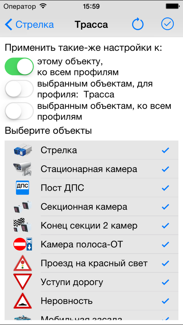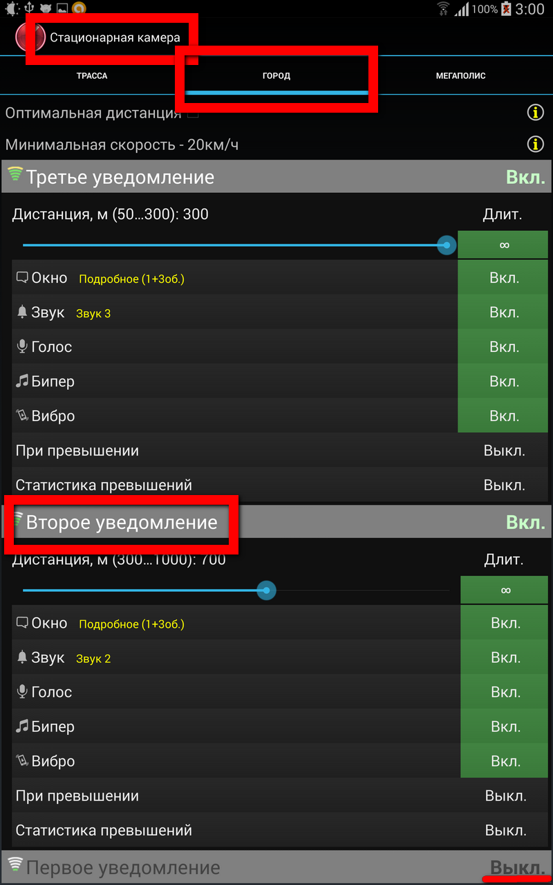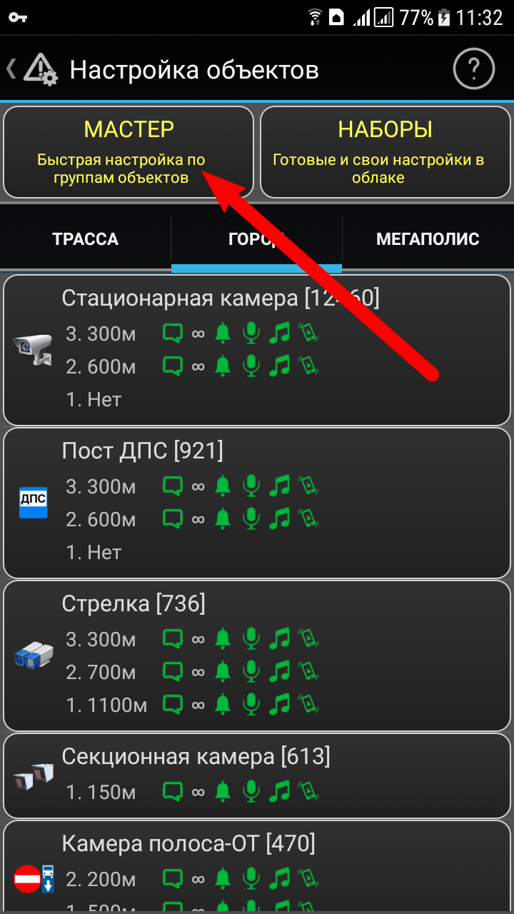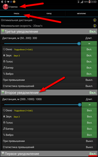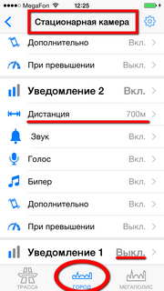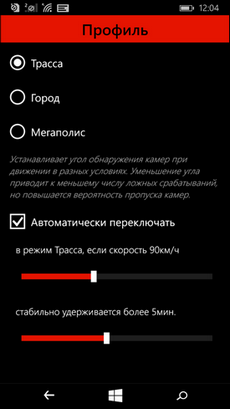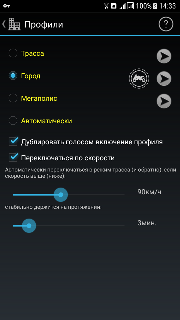 Профили трасса-город-мегаполисПрофили позволяют быстро переключать все настройки объектов вручную или автоматически при движении. Программа поддерживает три профиля: Трасса, Город/Мотоцикл, Мегаполис. Профиль Город можно легко перенастраивать под Мотоцикл. Также можно включить полностью автоматическое переключение профилей и переключение по скорости. "Авто" - сам определяет момент переключения в зависимости от плотности камер впереди. "По скорости" - доступен при выборе "Город" или "Мегаполис" и переключает в "Трасса" при удержании определенной скорости определенное время. Каждый из профилей имеет свой блок настроек уведомлений по объектам. Например для Стрелки можно настроить так: трасса - 1700м, город 1000м, а в режиме мегаполис отключить первое, и оставить только второе и третье уведомление. Трасса - Город и Мегаполис - просто аббревиатуры. Можно было с тем-же успехом назвать широкий-средний-узкий сектор обнаружения. Или вообше Профиль1-Профиль2-Профиль3. К реальным городу и трассе никакого отношения не имеет. Задает только ширину сектора и уменьшает дистанции до камер, чтобы уменьшать ложные срабатывания от камер на параллельных улицах. Однако, опытные пользователи могут использовать профили для переключения настроек под разные режимы движения по своему усмотрению. ![]() Выбор и автоматическое переключениеЕсть полностью автоматическое переключение профилей и автопереключение по скорости. Окна выбора стартового профиля и настройки показаны на скриншотах.