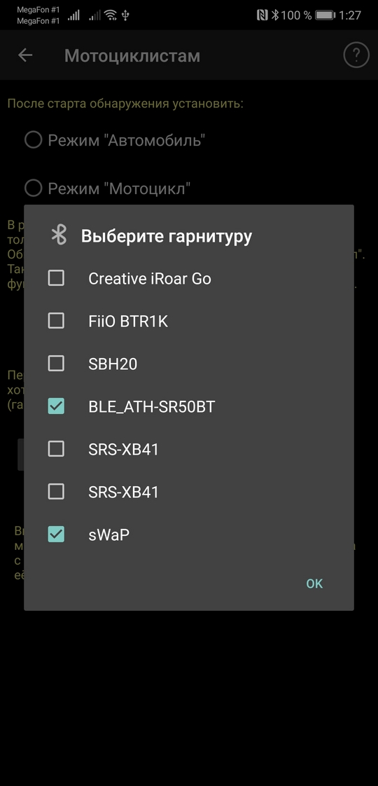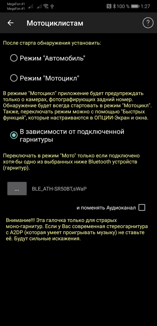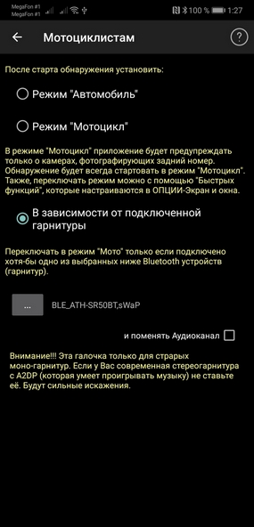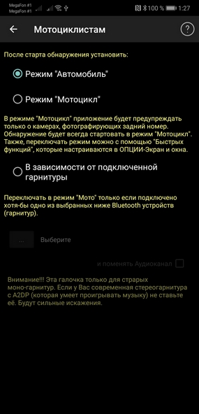 Антирадар еСтрелка - Настройки для мотоциклистовОпции для мотоциклистов позволяют переключить режим обнаружения камер видеофиксации ГИБДД после старта Антирадара для оповещения о радарах фотографирующих только задний номер. Доступны три варианта: 1. Всегда в режиме автомобиль - Антирадар еСтрелка предупреждает обо всех камерах видеофиксации 2. Всегда в режиме мотоцикл - Антирадар еСтрелка предупреждает только о камерах, фотографирующих задний номер 3. В зависимости от подключенной в данный момент bluetooth гарнитуры (только в платных версиях - см ниже). В этом режиме, при подключении указанных галочками гарнитур Антирадар еСтрелка перейдёт в режим "Мотоцикл", если гарнитуры не подлючены - то в режим "Автомобиль". доступно в Антирадар еСтрелка PRO ![]() Кроме этого переключиться Авто-Мото можно через быстрые функции. Для этого предварительно установите кнопку "Авто-Мото" в удобном месте. Далее это выполняется в два нажатия. ![]() Включенный режим отображается значком и на основном окне (автомобиль на скриншоте) и на летящей кнопке (мотоцикл на скриншоте) А знаете-ли вы, что попробовать многие из настроек можно в "демо-режиме" - долгое нажатие на кнопку старт на главном окне |