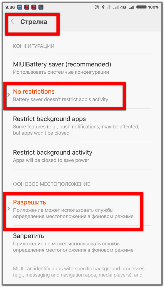 Антирадары на смартфонах Xiaomi, Miezu и т.п. с MIUIПодробнейшее видео по настройке смартфона Xiaomi - 2021 В аппаратах Xiaomi с прошивкой miui сделано очень много оптимизаций, которые не дают работать Стрелке в фоне и показывать окна. Кратко1. Разрешить для Стрелки всплывающие окна Статья по этому поводу http://android.mobile-review.com/articles/49032/ О неприходящих уведомлениях после восстановления локального бэкапа - внизу. О несрабатывающем автозапуске по событиям - тоже внизу. ПодробноСначала нужно сделать все действия из раздела Основное по Андроид . Ниже приведены целая серия различных ухищрений для разных смартфонов и разных версий систем. Они могут несколько отличаться от того, что вы видите на своем экране, но суть одна: для оптимизации потребления энергии через несколько минут бездействия отключается геолокация (GPS), а в целях усиления безопасности по-умолчанию запрещены всплывающие окна. Рецепты (читайте все рецепты!!! Они выделены жирным): Рецепт 1. В прошивках MIUI по-умолчанию выключены всплывающие окна. Инструкции для MIUI-6 и MIUI-7 (спасибо Bara с rd-forum), для MIUI-8 и MIUI-9 (скриншоты ниже). Заходим в настройки. 1. Заходим "Все приложения" 2. Выбираем приложение "Стрелка" и заходим в "Уведомления" 3. Включаем "Всплывающие окна" ( а также Звуки, Вибрация, Индикатор) ![]() для MIUI9 ![]() 4. Далее возвращаемся в настройки приложения "Стрелка" и проматываем вниз. 5. Заходим в "Управления разрешениями" 6. Включаем всплывающие окна (и GPS тоже ,если выключен) ![]() для MIUI9 ![]() Инструкции для MIUI-5: Настройки, далее вкладка "Все настройки", далее найти "Приложения". В списке программ найти Strelka, и соответственно включить всплывающие окна. ![]() Рецепт 2. Нужно разрешить для Стрелки GPS в фоновом режиме. (Иначе через 2-3 минуты после ухода в фон программа перестает предупреждать). Настройки -> Батарея и производительность -> Управление использованием питания -> Приложения -> Стрелка -> Установить (как на последнем скриншоте): 1. No restrictions 2. Разрешить использование местоположения в фоновом режиме ![]() ![]() ![]() ![]() MIUI-8 немного отличается, но суть та-же ![]() ![]() ![]() ![]() ![]() MIUI-9 - также отключите все оптимизации энергопотребления ![]() Рецепт 3. На Xiaomi с пятым андроидом есть иконка Сервис,на рабочем столе. Жмем на нее ,потом Разрешения, потом Управление разрешениями,потом вверху опять Разрешения и внизу,в списке Всплывающие окна. Там ставим галку на нужное приложение и все работает. Рецепт 4. Оптимизация оперативной памяти и ускорение GPU Рецепт необязательный, помогает на некоторых смартфонах и некоторых прошивках. Включаем раздел "для разработчиков", если он не включен (7 раз тапнуть по версии miui). Далее в разделе дополнительно появится пункт для разработчиков. В нем ищем оптимзация системной памяти и отключить. Пробовал разные пункты оптимизации памяти , помогло только отключить. Спасибо yuri4002 с 4pda. ![]() для MIUI-8 ![]() Еще: стоял интервал 5 минут. Установил "никогда" - все работает ![]() Дополнительно. По сути - тоже самое (убрать все ограничения для Антирадар Стрелка), но выглядит иначе MIUI11-12 - Настройки-Питание и производительность-Контроль активности-Стрелка-> поставить "нет ограничений" Режим "Безопасность энергосбережение". ![]() При пропадании уведомления на экране блокировки В настройках выключить параметр "пропускать экран блокировки". Если он включен - нету текста со скоростью и картинок с объектом. ![]() Если не срабатывает автозапуск по с