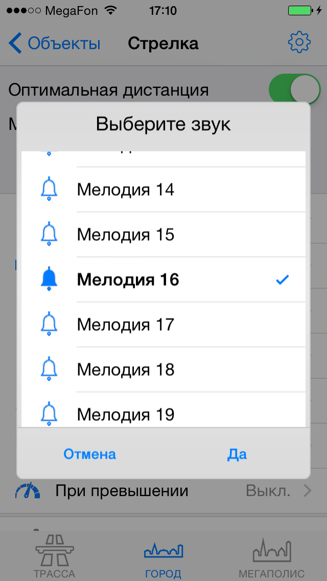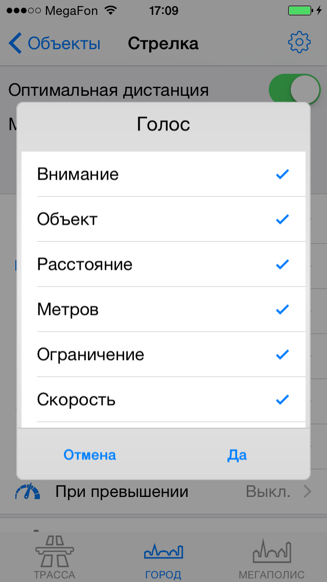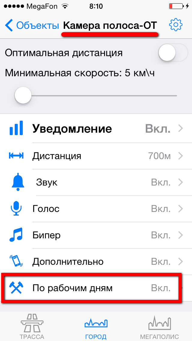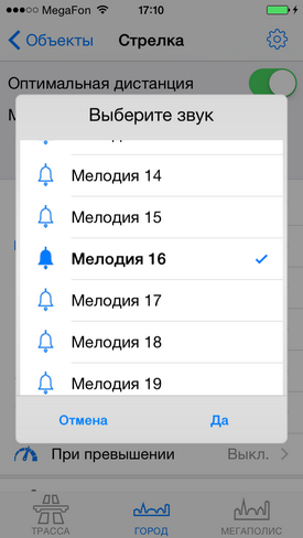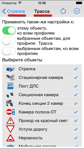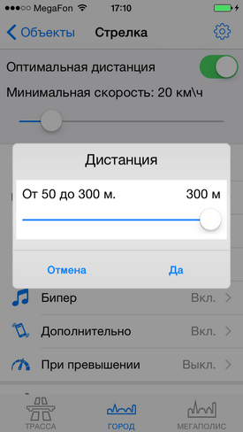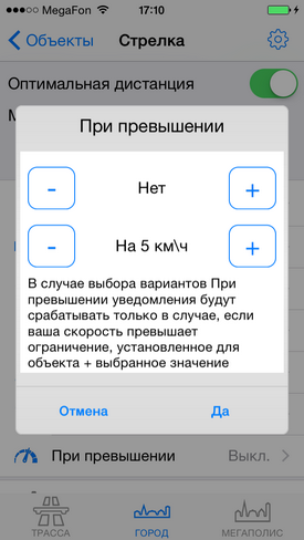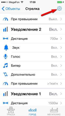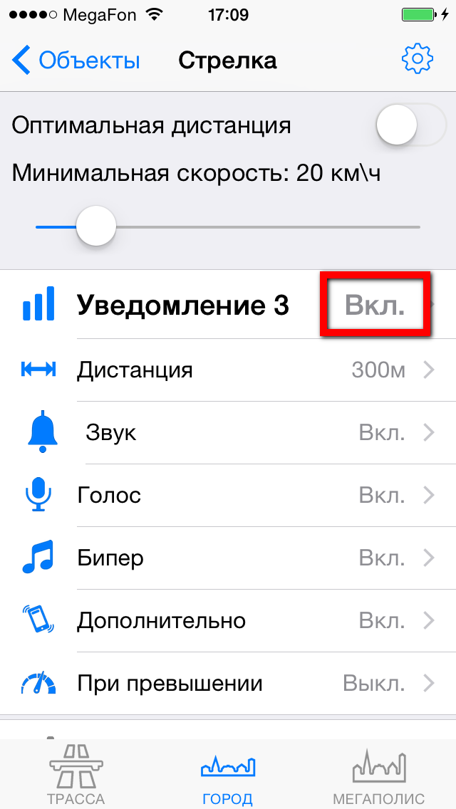 Настройка уведомлений по объектамРекомендуем ознакомиться с разделом "Профили"! Видеоролик: Антирадар Стрелка - 2021 При движении на объект и достижении установленных пользователем дистанций происходит уведомление, которое включает в себя: - выдачу на экран информации об объекте, дистанции до него, ограничения скорости и до трех объектах впереди. - Звуковое и голосовое уведомление - Вибрацию и напоминание (баннер) поверх других окон - После уведомления по мере приближения к объекту звучит бипер, напоминающий о том, что вы в зоне действия объекта. Все эти параметры можно настроить по своему желанию для каждого из объектов (камер) и для каждого профиля (город-трасса...) ![]() В зависимости от типа объекта настраивается одно или три уведомления по дистанциям. Для простых объектов и "не измеряющих скорость" - одно, для сложных и потенциально опасных - три. По каждому из объектов можно выключить любое из уведомлений, настроить дистанцию, звуки, голос, бипер, вибро. Для настройки уведомлений необходимо нажать кнопку ОБЪЕКТЫ, а затем выбрать тип объекта, например Стрелка. ![]() Вы видите три блока по дистанциям: Уведомление1, Уведомление2, Уведомление3. Их можно настроить отдельно для каждого из профилей Город, Трасса, Мегаполис. Настройка уведомлений для объектовБудьте внимательны - значения настраиваются для каждого из профилей! Можно целиком выключить предупреждение, нажав "Вкл" справа от него (рис.1.) или настроить предупреждение. - Дистанция - устанавливает дистанцию срабатывания (рис.2.). - Звук - предварительный короткий звук (рис.3.). Можно выбрать встроенный (40 звуков на выбор) или из файла предварительно загруженного через iTunes (описание ниже) ![]() - Голос - это те фразы, которые будут сказаны "Внимание", "Стрелка", "Тысяча двести", "метров", "ограничение", "шестьдесят" - можно включить или выключить каждую из фраз по-отдельности (рис.4.) - Бипер - "пикающий" звук в периоды между основными предупреждениями. Напоминает о камере впереди. Настраивается разная частота для разных объектов, длительность сигнала и паузы (рис.5.). ![]() - Дополнительно - Вибро (включает - выключает вибрацию) - Напоминания - Когда программа в фоновом режиме - будут выводиться баннеры-напоминания поверх других программ. Если аппарат выключен - то включится и выведет уведомление поверх локскрина. Обратите внимание, для корректной работы напоминаний, они должны быть разрешены (Раздел 3 в Частых вопросах) ![]() ![]() - При превышении - позволяет установить для каждого из предупреждений значения для визуального отображения и для аудио (звук-голос-бипер). Аудиочасть может быть больше или равной визуальной. При установке значений, отличных от "Нет" - уведомления будут появляться только в случае превышения скорости. - По рабочим дням - работает только для камер, контролирующих полосу общественного транспорта. Отключает уведомления в выходные дни ![]() Общие настройкиПоказаны в третьем ряду картинок. - Оптимальные дистанции - если выбрана эта галочка, то первое уведомление будет происходить на дистанции, указанной в качестве оптимальной модераторами rd-forum. Дальнейшие уведомления - по заданным вами параметрам. В случае, если у объекта не указана оптимальная дистанция - будут использованы заданные параметры. - Минимальная скорость - ниже этой скорости уведомлений по данному объекту происходить не будет. Да
