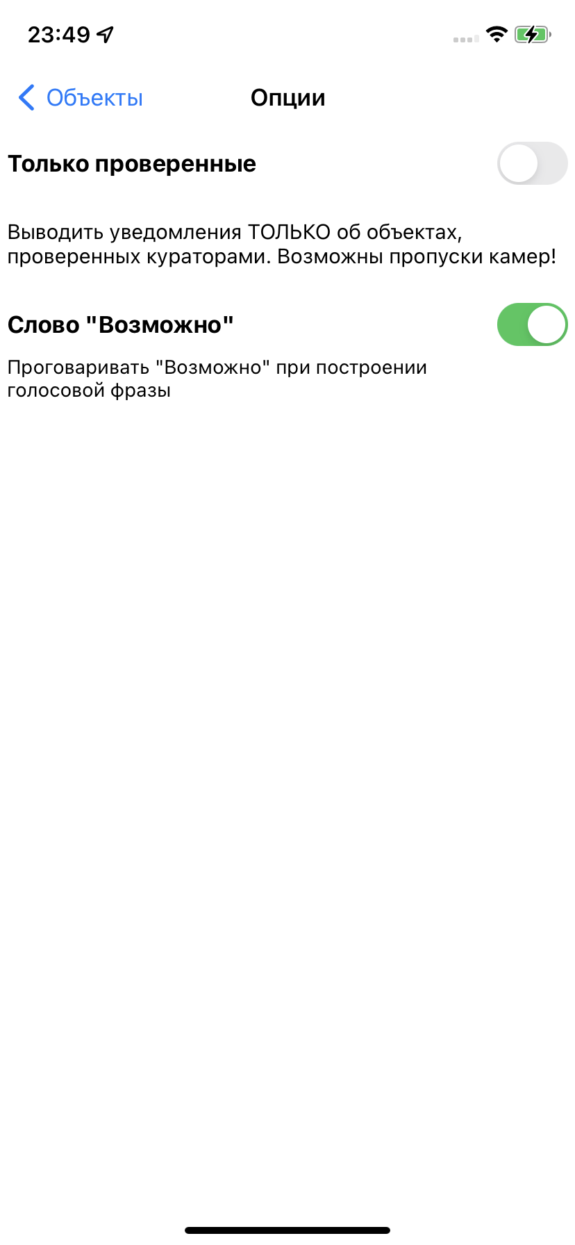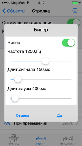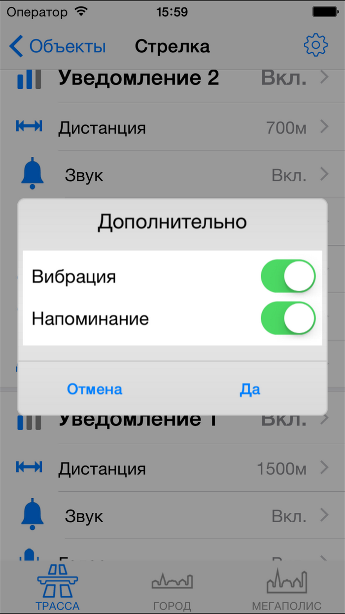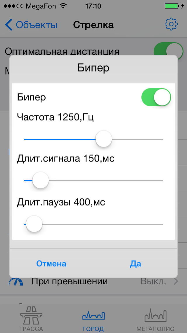 Настройка уведомлений по объектамРекомендуем ознакомиться с разделом "Профили"! Видеоролик: Антирадар Стрелка - 2021 При движении на объект и достижении установленных пользователем дистанций происходит уведомление, которое включает в себя: - выдачу на экран информации об объекте, дистанции до него, ограничения скорости и до трех объектах впереди. - Звуковое и голосовое уведомление - Вибрацию и напоминание (баннер) поверх других окон - После уведомления по мере приближения к объекту звучит бипер, напоминающий о том, что вы в зоне действия объекта. Все эти параметры можно настроить по своему желанию для каждого из объектов (камер) и для каждого профиля (город-трасса...) ![]() В зависимости от типа объекта настраивается одно или три уведомления по дистанциям. Для простых объектов и "не измеряющих скорость" - одно, для сложных и потенциально опасных - три. По каждому из объектов можно выключить любое из уведомлений, настроить дистанцию, звуки, голос, бипер, вибро. Для настройки уведомлений необходимо нажать кнопку ОБЪЕКТЫ, а затем выбрать тип объекта, например Стрелка. ![]() Вы видите три блока по дистанциям: Уведомление1, Уведомление2, Уведомление3. Их можно настроить отдельно для каждого из профилей Город, Трасса, Мегаполис. Настройка уведомлений для объектовБудьте внимательны - значения настраиваются для каждого из профилей! Можно целиком выключить предупреждение, нажав "Вкл" справа от него (рис.1.) или настроить предупреждение. - Дистанция - устанавливает дистанцию срабатывания (рис.2.). - Звук - предварительный короткий звук (рис.3.). Можно выбрать встроенный (40 звуков на выбор) или из файла предварительно загруженного через iTunes (описание ниже) ![]() - Голос - это те фразы, которые будут сказаны "Внимание", "Стрелка", "Тысяча двести", "метров", "ограничение", "шестьдесят" - можно включить или выключить каждую из фраз по-отдельности (рис.4.) - Бипер - "пикающий" звук в периоды между основными предупреждениями. Напоминает о камере впереди. Настраивается разная частота для разных объектов, длительность сигнала и паузы (рис.5.). ![]() - Дополнительно - Вибро (включает - выключает вибрацию) - Напоминания - Когда программа в фоновом режиме - будут выводиться баннеры-напоминания поверх других программ. Если аппарат выключен - то включится и выведет уведомление поверх локскрина. Обратите внимание, для корректной работы напоминаний, они должны быть разрешены (Раздел 3 в Частых вопросах) ![]() ![]() - При превышении - позволяет установить для каждого из предупреждений значения для визуального отображения и для аудио (звук-голос-бипер). Аудиочасть может быть больше или равной визуальной. При установке значений, отличных от "Нет" - уведомления будут появляться только в случае превышения скорости. - По рабочим дням - работает только для камер, контролирующих полосу общественного транспорта. Отключает уведомления в выходные дни ![]() Общие настройкиПоказаны в третьем ряду картинок. - Оптимальные дистанции - если выбрана эта галочка, то первое уведомление будет происходить на дистанции, указанной в качестве оптимальной модераторами rd-forum. Дальнейшие уведомления - по заданным вами параметрам. В случае, если у объекта не указана оптимальная дистанция - будут использованы заданные параметры. - Минимальная скорость - ниже этой скорости уведомлений по данному объекту происходить не будет. Да